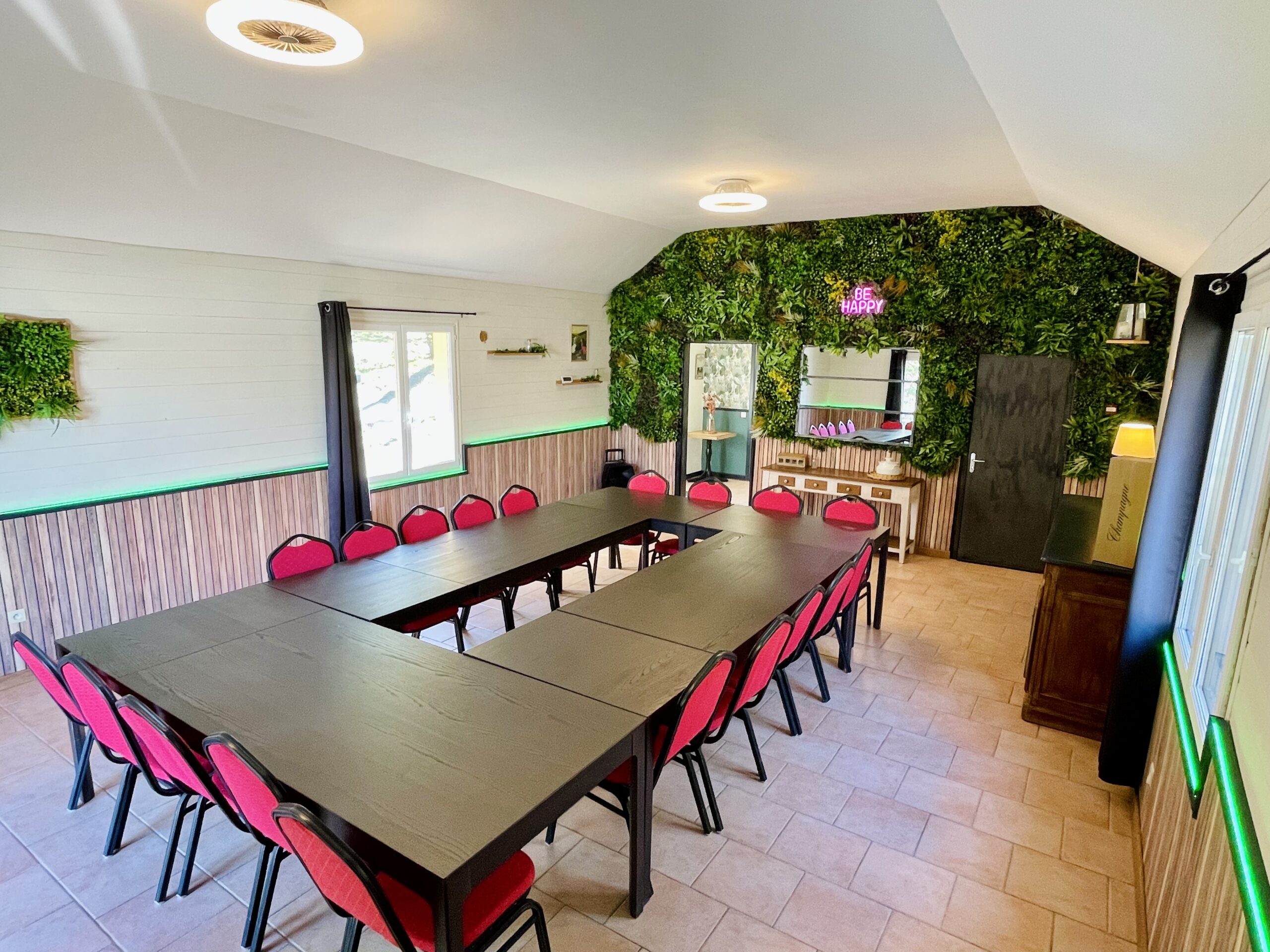 Our main meeting room is fully modular. It is equipped with all the necessary materials: large screen, sound system, high-speed WiFi connection, flip chart, and office supplies. The natural light and the view of our wooded park create a pleasant working atmosphere, essential for a productive nature retreat in Périgord.