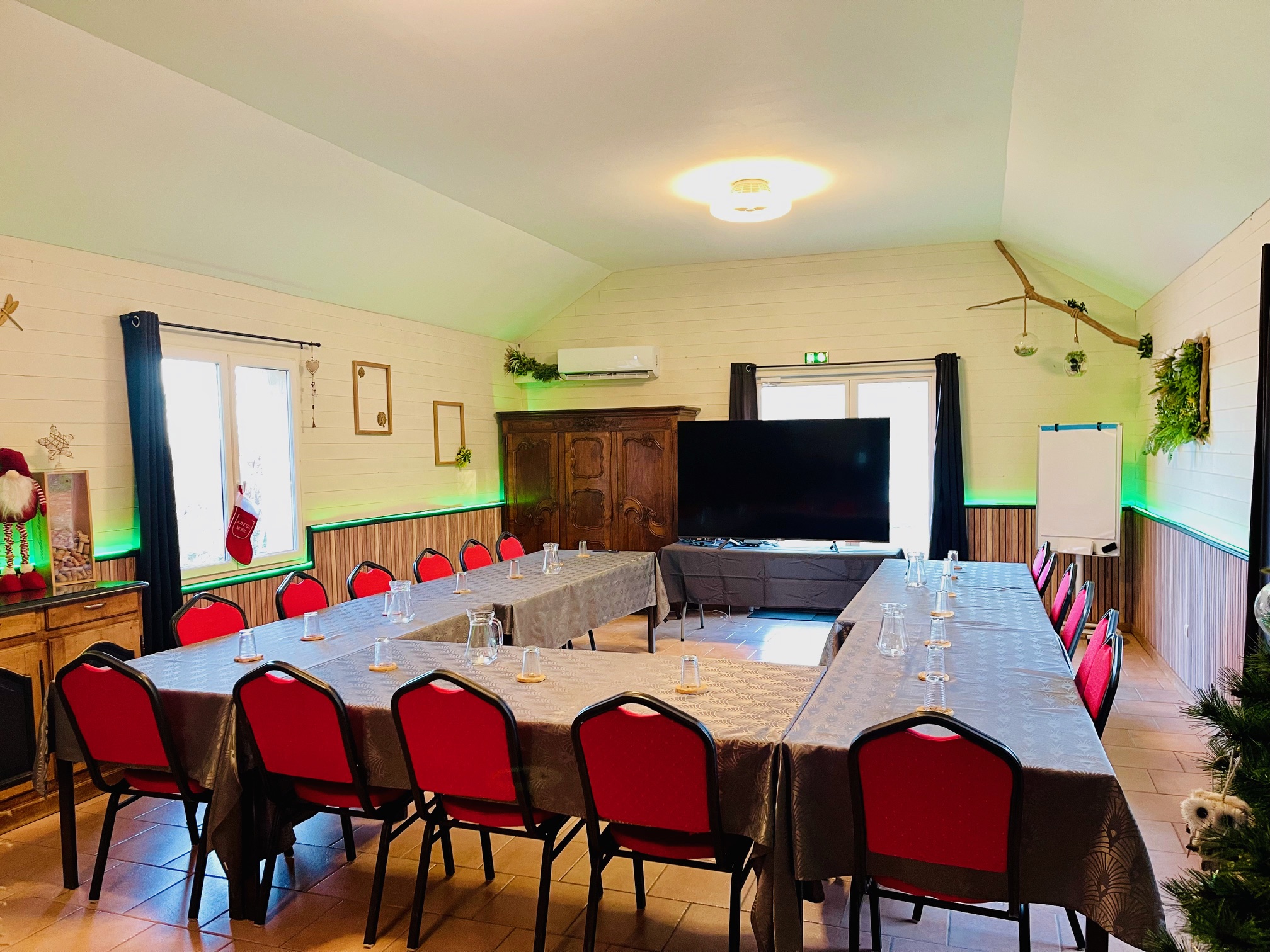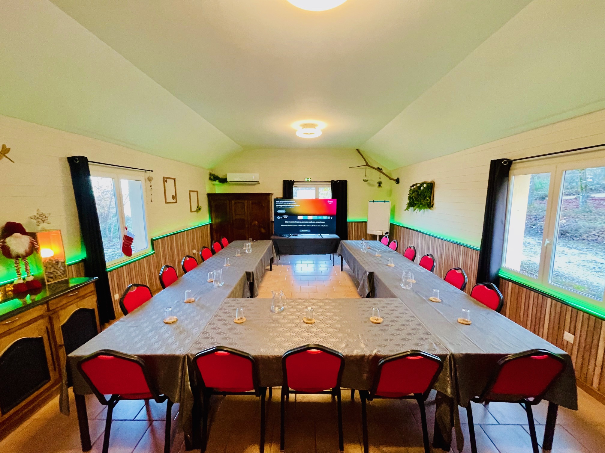 Notre salle de réunion principale est entièrement modulable. Elle est équipée de tout le matériel nécessaire : grand écran, système de sonorisation, connexion Wi-Fi haut débit, paperboard et fournitures de bureau. La lumière naturelle et la vue sur notre parc boisé créent une atmosphère de travail agréable, essentielle pour un séminaire nature en Périgord productif.